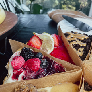 Variety desserts are perfect for gatherings. For my sister's event, I decided to top the cheesecake slices with four different vibes: Tropical Strawberry, White Chocolate Berry, Apple Crumble, and Chocolate-Peanut Butter Cookie.